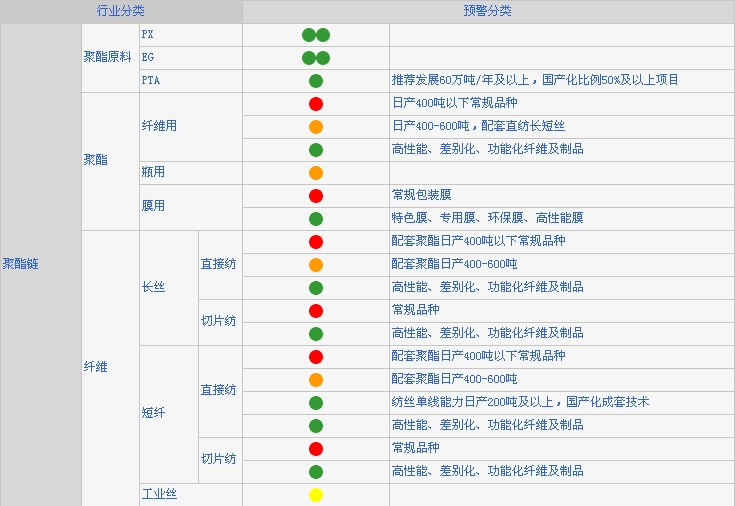 本預(yù)警系統(tǒng)監(jiān)測(cè)的品種涵蓋化纖行業(yè)主要產(chǎn)品,分為紅、橙、黃、綠、雙綠五種類別,分別代表風(fēng)險(xiǎn)極大,風(fēng)險(xiǎn)較大、有一定風(fēng)險(xiǎn)、鼓勵(lì)發(fā)展、重點(diǎn)扶持??梢越Y(jié)合預(yù)警類別及內(nèi)容,根據(jù)企業(yè)生產(chǎn)經(jīng)營(yíng)實(shí)際情況進(jìn)行判斷。