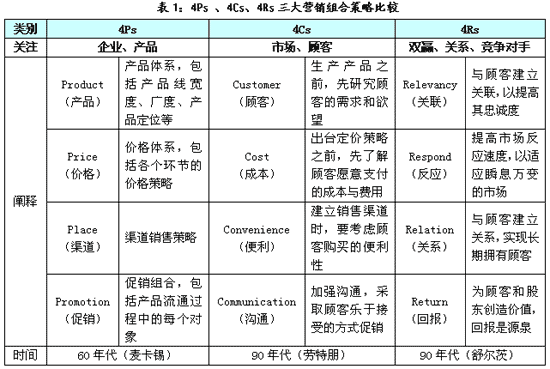 當然,4Rs同任何理論一樣,也有其不足和缺陷。如與顧客建立關聯(lián)、關系,需要實力基礎或某些特殊條件,并不是任何企業(yè)可以輕易做到的。其實,4Ps 、4Cs、4Rs都從不同的角度提供了很好的思路,不能簡單地說哪個理論好,哪個理論差,它們只是適用的場合不同罷了,都是經營者和營銷人員應該了解和掌握的。這三大理論總結如表1所示: